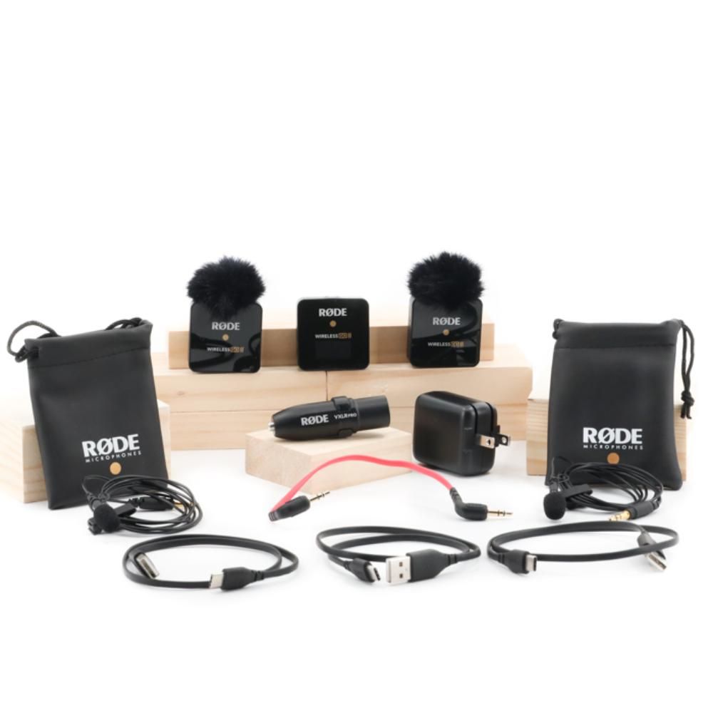 The Rode Wireless GO II Mic/Recorder Kit is a super small wireless audio system that consists of a dual channel receiver, 2 transmitters, and 2 clip-on lavalier microphones. To get started, press and hold power on your receiver then hold the power button on each of the transmitters one at a time. They should automatically pair (to disconnect, single-click the pair button followed by a 3-second hold).